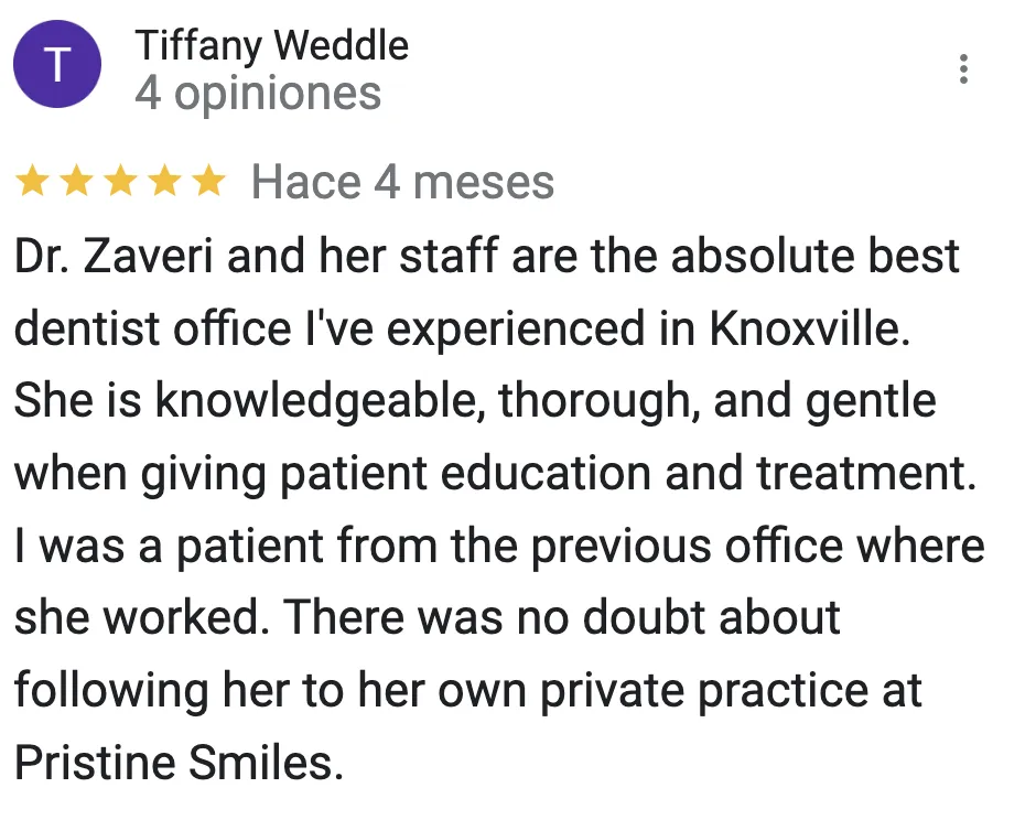 With 200+ five-star reviews, Pristine Smiles is proud to be one of Knoxville’s most trusted dental offices. Patients consistently choose us for our kindness, comfort, and honest care.